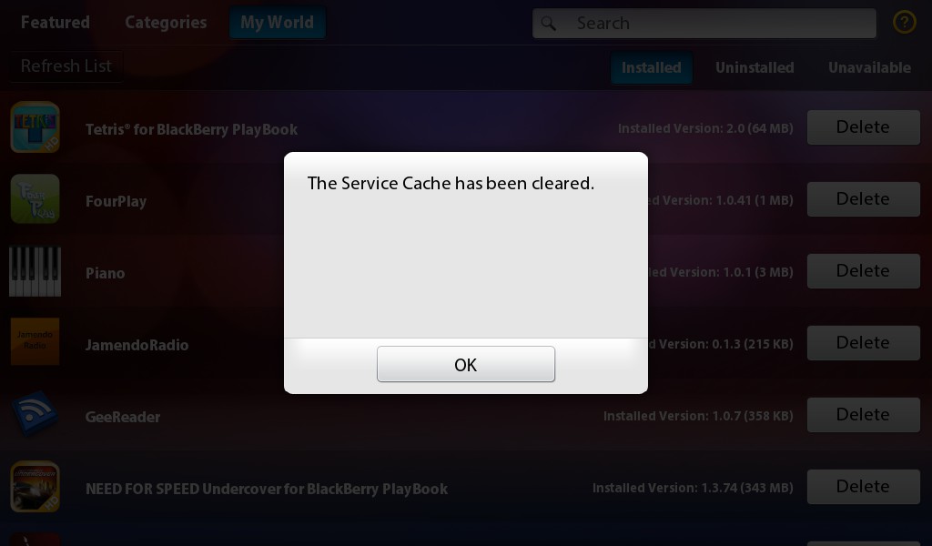 AppWorldのキャッシュクリア PlayBook X Facebook はてブ Pocket LINE コピー 2011.05.19 情報元はTwitterです(有り難うございます<(_ _)>) ■BlackBerryの場合 AppWorldを起動しaltキーを押したまま「rst」と入力する。 ■Playbookの場合 AppWorldを起動後キーボードを出し(本体左下から画面中央に向かってスワイプ)「rst」と入力する。 「The Servis Cache~」と出るのでOKを選択。 少し挙動がおかしくなったときにお試しください。