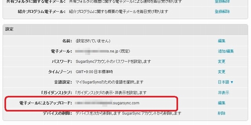 パソコンでSugarSyncを開きアカウントの管理画面に入ると「電子メールによるアップロード」という項目があり送信先アドレスが表示されています。