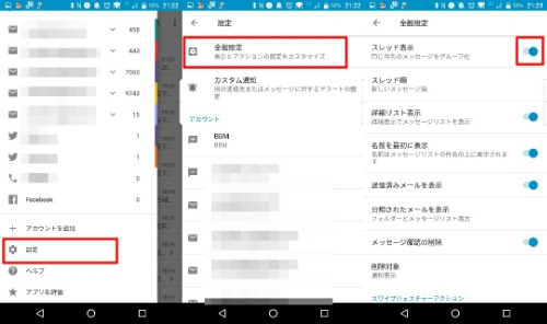 設定から全般設定を選択してスレッド表示のチェックをオフにします。
